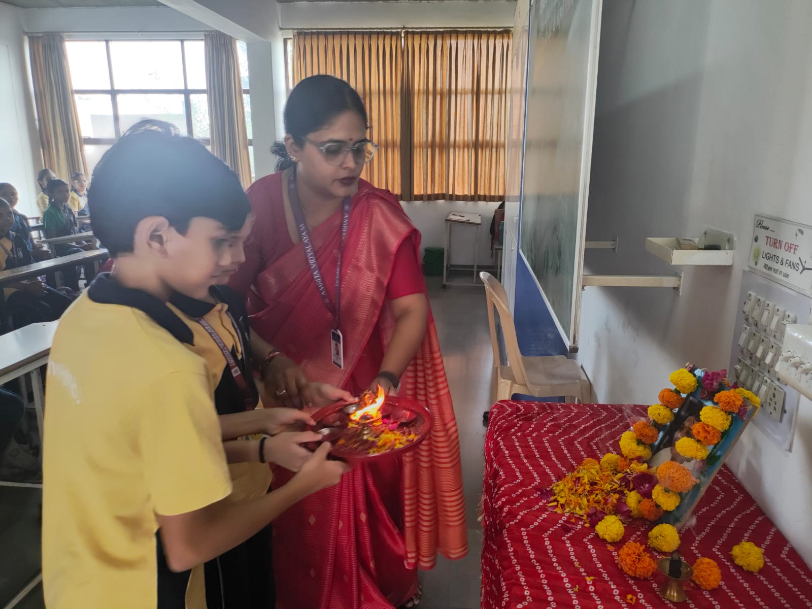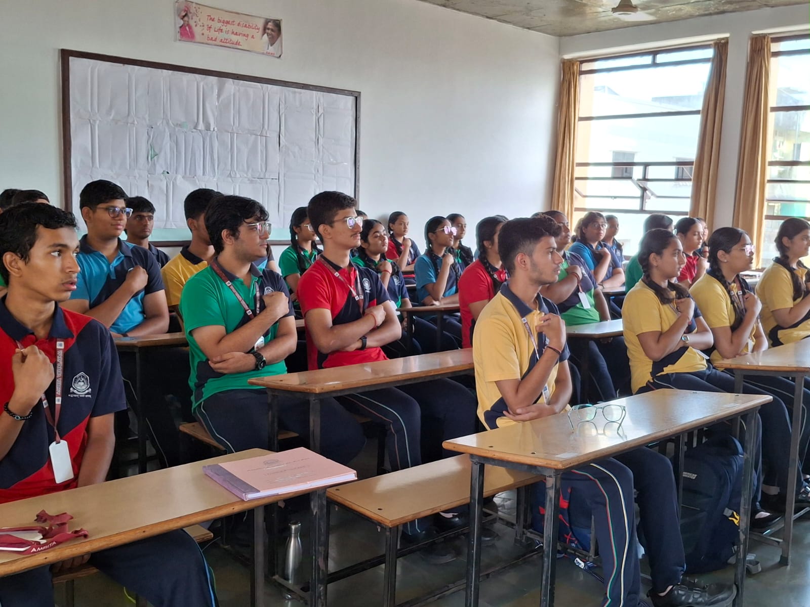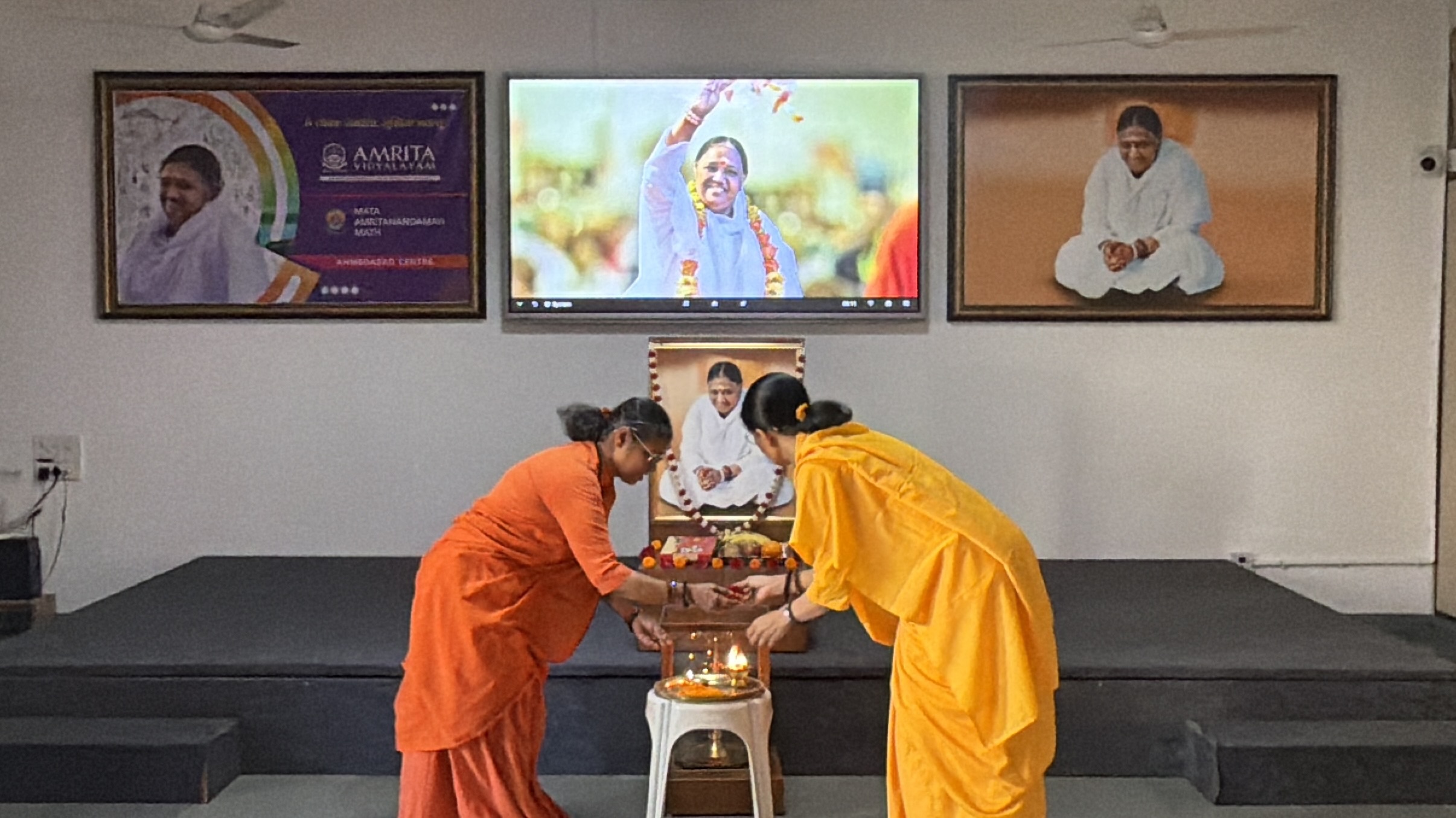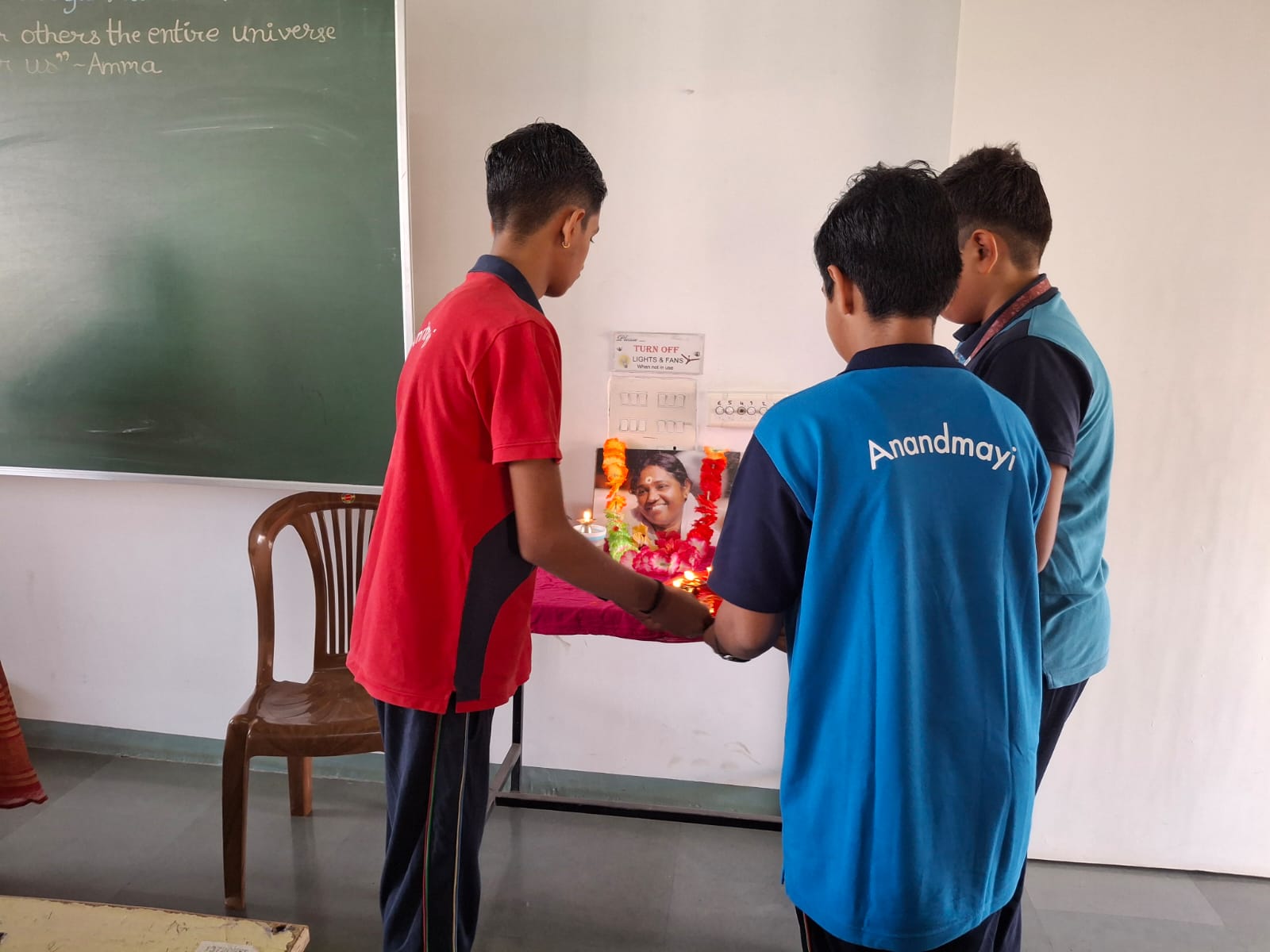 The morning assembly was conducted with solemnity and devotion. The chanting of Amma’s Ashtotharam and the collective performance of aarti by students and teachers created a serene and spiritually uplifting environment within the campus.